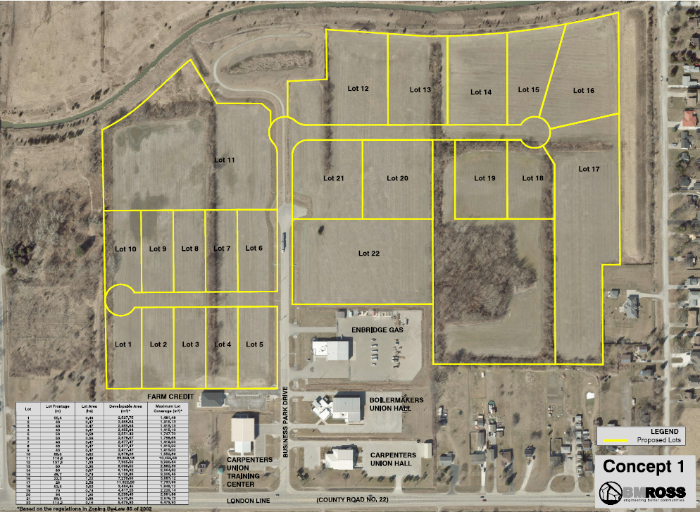 In November 2024, Sarnia City Council endorsed the following concept for the future build-out of the Sarnia 402 Business Park. The concept includes the creation of 22 industrial lots. Access will be provided from an extension of Business Park Drive to the north and east and a new cul-de-sac to the west. The industrial lots would have frontages between 53.0 metres (174 ft) and 114.2 metres (375 ft) and areas between 0.47 hectares (1.16 acres) and 3.49 hectares (8.62 acres).