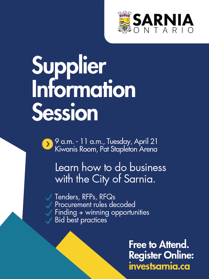 On Tuesday, April 21 from 9 am to 11 am at Pat Stapleton Arena the City of Sarnia is hosting a Supplier Information Session for local businesses and suppliers who want to better understand how to work with the City and how the tendering and competitive procurement processes operate.